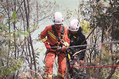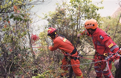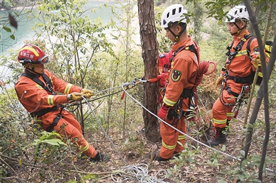 在半山腰一处落差10余米的峭壁上方,喻志坤先将2根救援主绳分别留出一大截,固定在一棵直径约30厘米的松树根部,并扣上安全挂钩,然后把留出的救援绳分别在另一棵松树上各打了附结。“山岳救援安全措施必须到位,这么做能提供双重保护。”喻志坤解释。