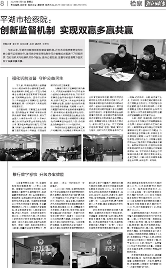 今年以来,平湖市检察院创新检察监督机制,在生态环境损害赔偿与检察公益诉讼衔接协作、推行数字卷宗单轨制协同办案模式方面进行了积极探索,在行政机关与检察机关协作配合、提升办案效能、监督与被监督等方面实现了双赢多赢共赢。