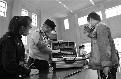 近日,杭州铁路公安处台州火车站派出所铁路民警加强治安巡逻,配合防疫部门对进出站旅客进行体温检测、信息登记、身份核验等工作,全力护航学生返校、工人返岗。图为5月5日下午,铁路民警在安检区域开箱检查旅客随行携带物品。通讯员 林利军