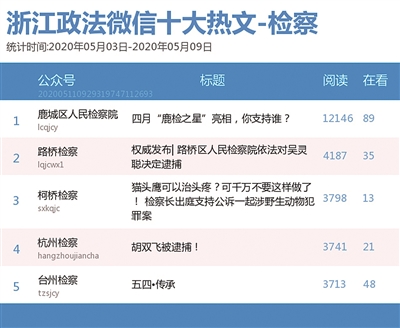 本期检察院榜,“杭州检察”稳坐榜首,“路桥检察”跻身第二名。在热文榜上,“鹿城区人民检察院”的《四月“鹿检之星”亮相,你支持谁?》一文,拿下第一。