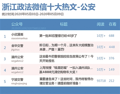 公安榜上,“后浪”“小欣漫画”入榜,取得了第三的好成绩。热文榜上,有4篇推文获得10万+阅读数,其中“小欣漫画”的《第一批80后警察已经40岁了》一文,拿下最高阅读数和在看数。“小欣漫画”通过漫画记录下民警工作中的酸甜苦辣,深受大众喜爱。