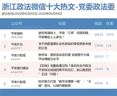 本期党委政法委榜,“平安开化”冲上冠军宝座,“平安鹿城播报”“平安六和塔”紧随其后。热文榜上,“平安温岭”的《@所有温岭人,平安“三率”你我知晓,平安建设人人参与!》一文,获得最高阅读量。