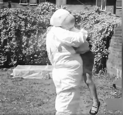 英国一名外婆为能抱抱小外孙,从头到脚全副武装:防护服、口罩、护目镜,一样也不少。谢拉·阿博特现年60岁,是一家超市的收银员。她十分想念6岁的外孙马松,想拥抱他却担心传染病毒,就全副武装来到女儿家后院,准备给马松一个惊喜。谢拉把头套系得很紧,以免露出皮肤。不过,用她的话说,“仅仅是能够拥抱他、透过防护服感觉到他的双手,就值了”。