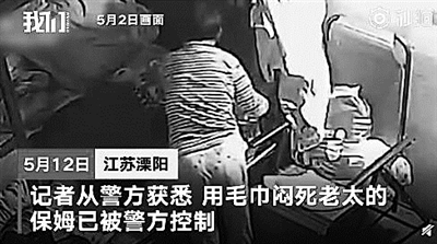 5月12日,记者从江苏溧阳警方获悉,用毛巾闷死老太的保姆已被警方控制。5月2日,江苏一保姆闷死83岁老人。视频画面中,保姆先用毛巾捂住老人面部,后坐在老人身上,期间老人多次挣扎。家属称,保姆是老乡,她工作了仅8天,双方相处很好并无矛盾与怨恨,保姆事后还镇定地教家属如何处理后事。