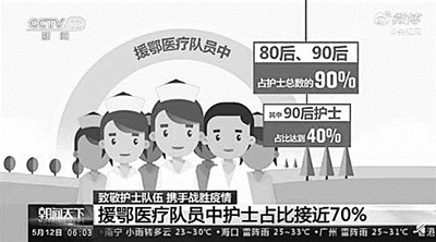战“疫”期间,无论在重症监护病区、发热门诊还是方舱医院,都可以看到护士们忙碌的身影。5月12日,据央视消息,援鄂医疗队护士占比接近70%,医疗队员中90%是8090后护士,向他们致敬。