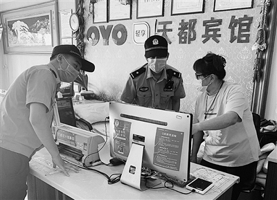 为确保辖区治安秩序稳定,连日来,天台县公安局城西派出所一手抓疫情防控,一手抓安全监管,组织民警深入辖区排查安全隐患,督促各项措施落实到位。图为民警在宾馆检查旅客身份信息登记情况。通讯员 许尚高 徐剑杰