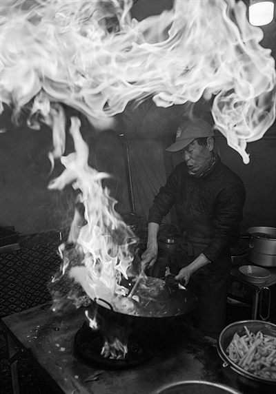 在海拔6500米的珠峰前进营地厨房里,厨师在炒菜。