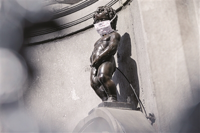 5月16日,在比利时布鲁塞尔,“小尿童”于连塑像被戴上口罩。