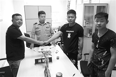 近日,在台州市椒江区下陈街道务工的河南籍老乡石某和王某因琐事引起矛盾纠纷。下陈派出所“胜利”调解室辅警陈胜利介入后讲法说理共情,不到10分钟,刚刚还争得面红耳赤的石某和王某就平静下来,随即握手言和并签订了调解协议书。通讯员 何文斌 摄