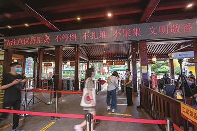 6月2日,杭州灵隐寺因疫情关闭4个月后有序恢复开放,游客可通过“杭州西湖风景名胜区”或“西湖旅游”微信公众号等官方平台预约游览。因防疫需要,灵隐飞来峰景区每日限流3万人,游客进入寺院,需出示健康码、接受体温检测,并全程规范佩戴口罩。董旭明 摄
