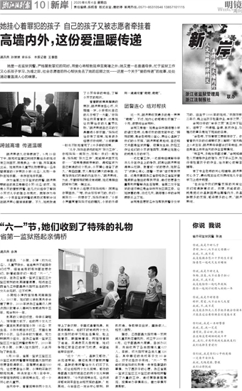 一边忙着工作,一边接电话调解母亲与儿子在作业上的争执,时常让胡凌燕觉得焦头烂额。抱着试一试的想法,她报名了“送暖心连心、团警一家亲”结对帮扶项目。这是共青团浙江省委和浙江省监狱管理局联合推出的帮扶项目,通过志愿者力量帮助民警解决生活难题。省第二女子监狱的结对单位是金华市开发区团工委。让她惊喜的是,没过几天,湖海塘小学的徐珂便联系上了她。