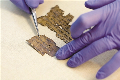 6月2日,在耶路撒冷,研究人员展示印有经文的死海古卷碎片。