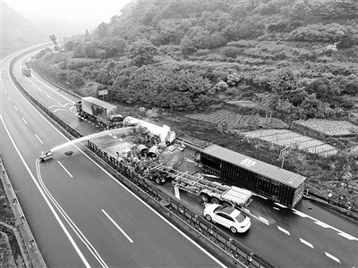 本报讯 6月7日22时25分许,G1512高速(甬金高速)新昌沙溪段往金华方向发生4车碰撞事故,导致一辆装载21吨液化天然气的槽罐车泄漏并起火。事故发生后,当地消防、高速交警、应急管理、环保、天燃气公司等部门的救援力量立即赶赴现场,消防指战员动用“消防机器人+无人机”进行联合处置。