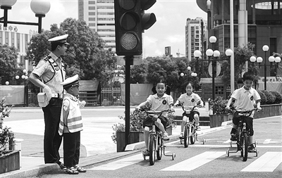 6月9日,孩子们在交警的指导下,在校园“交通安全模拟公路”上学习道路安全出行。