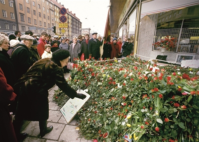 人们在前首相奥洛夫·帕尔梅遇刺地点摆放鲜花的资料照片(1986年3月1日摄)。