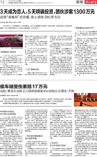发现自己的摩托车被盗后,车主徐某立即驾车追赶并逼停小偷,追逐中,小偷受伤。因此前多次盗窃,小偷付某被判刑。出狱之后,付某去鉴定了伤情,向徐某和徐某购买交强险的保险公司提出高达17万余元的赔偿款。