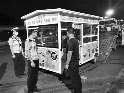 6月14日晚,临海交警在巡逻中发现,一男子无证驾驶无牌电动四轮车在104国道边摆摊卖夜宵。交警现场对男子进行了安全教育并扣留违法车辆,该男子还将面临行政处罚。交警提醒:在合法摆摊、文明经营的同时,也要遵守交通法律法规。