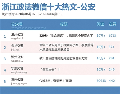 本期公安榜,夺榜高手“杭州公安”连续6次蝉联冠军宝座。热文榜上,共有4篇阅读量10万+的文章诞生,分别是“温州公安”的《329秒“生命通话”,温州这个警察火了》和《戳!全民摆地摊打开消防安全新方式》,“金华交警”的《金华市公安局关于征集陈小军、李彦照等人违法犯罪线索的通告》以及“宁波交警”的《“全军出击”!》。