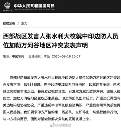西部战区新闻发言人张水利大校就中印边防人员位加勒万河谷地区冲突对外发表声明:6月15日晚,在中印边境加勒万河谷地区,印军违背承诺,再次越过实控线非法活动,蓄意发动挑衅攻击,引发双方激烈肢体冲突,造成人员伤亡。加勒万河谷地区主权历来属我。印边防部队出尔反尔,严重违反两国有关边境问题协定协议,严重违反中印军长级会谈共识,严重损害两军关系和两国人民感情。我们要求印方严格约束一线部队,立即停止一切侵权挑衅行动,与中方相向而行,回到对话会谈解决分歧的正确轨道上来。