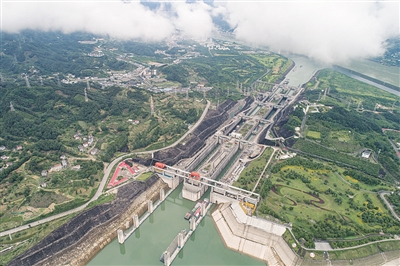 这是6月18日在大坝上游拍摄的稳健运行的三峡船闸(无人机照片)。