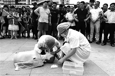 近日,临海市杜桥镇在三角绿岛公园开展防溺水宣传活动。图为专业医生在为群众演示如何对溺水者进行抢救。
