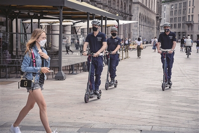 6月26日,三名当地警察骑着踏板车在意大利米兰的大教堂广场巡逻。