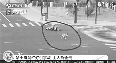 遛狗不拴绳哈士奇闯红灯撞翻电动车主人全责