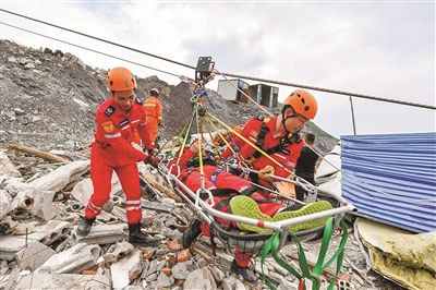 “搜救犬对倒塌工棚进行地毯式搜寻。”