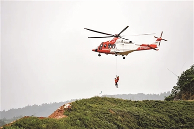 “人员固定后,救生员示意直升机快速转移受困群众……”