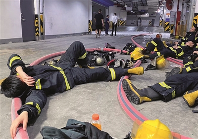 随后,指挥员安排消防员一次次进入现场,用泡沫覆盖的方法,为车辆降温。消防员背负80多斤的装备,处置完火灾现场后,累得趴在地上。