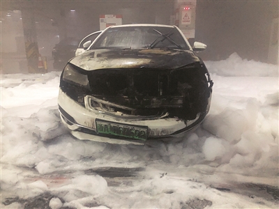 原来,起火的是地下一楼的一辆新能源汽车,消防员在浓烟笼罩的车库内确认火点后,很快扑灭了明火,但当指挥员用热成像仪探测后,发现车辆内部温度仍然极高,且电池位置不断有烟气冒出。
