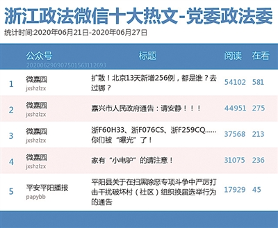 本期党委政法委榜,“微嘉园”表现优异,不仅夺取了双料冠军,还霸占了热文榜前四名。《扩散!北京13例新增256例,都是谁?去过哪?》《嘉兴市人民政府通告:请安静!》《家有“小电驴”的请注意啦!》等与民生息息相关的热文,吸引了不少读者的眼球。