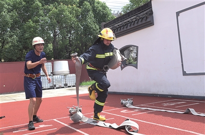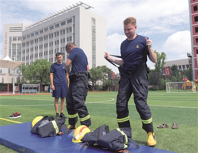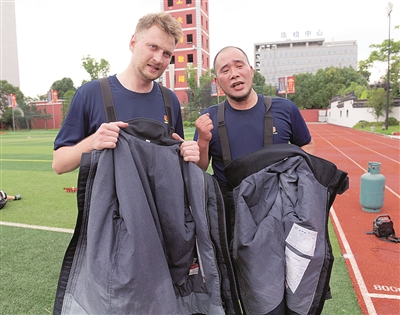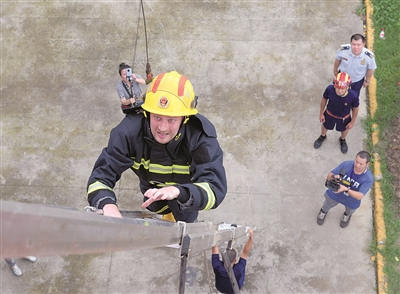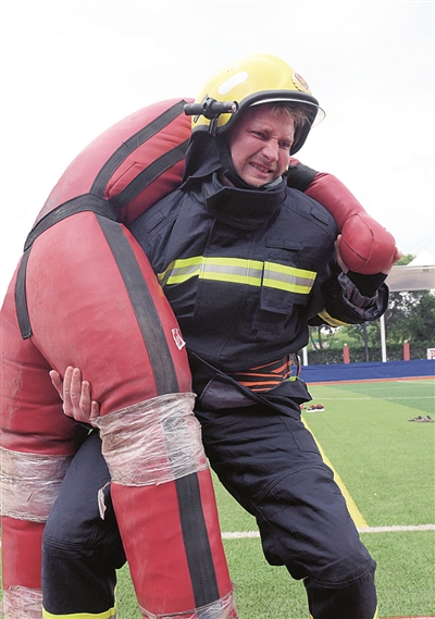 快速着装、一人两带、攀爬15米金属拉梯上四楼、扛着60公斤的假人负重跑……近2个小时的体验,德米日和胡子哥可谓苦不堪言,不断感慨这些项目是“一看就会,一练就废”。