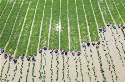 7月8日,暴雨过后,长兴县虹星桥镇谭家村组织党员志愿者组建助农小分队,抢抓有利天气,帮助村民和低收入农户进行水稻秧苗补种和单季稻抢播。田间地头,一片耕田、运秧、插秧的繁忙景象。陈晓伟 谭云俸 摄