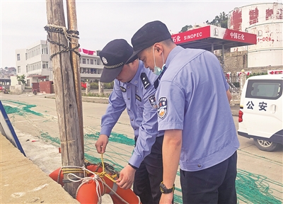 入夏以来,玉环市坎门派出所持续开展防溺水安全隐患排查行动,每天对辖区易发生溺水事故的海洋、湖泊、水库等水域进行地毯式排查,检查防溺水警示牌、防护栏、防护网等是否完好无损。图为7月9日,社区民警在检查救生圈。