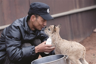7月8日,三江源国家公园管理局长江源园区可可西里管理处卓乃湖保护站的工作人员才文多杰在给一只藏羚羊幼仔喂奶。