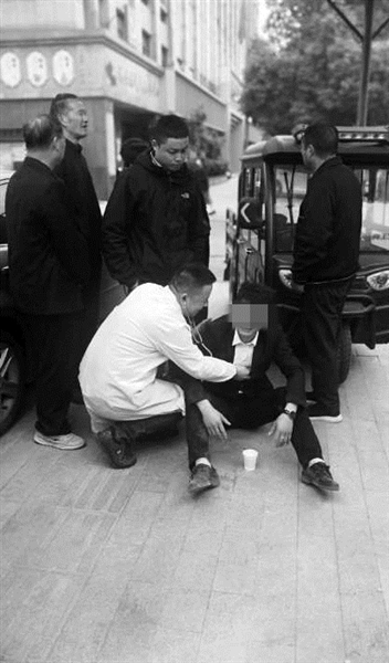 | 王某救火后瘫坐在地,接受医生检查 |
