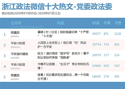 本期政法委榜,“平安六和塔”成功上位,超越“微嘉园”拿下榜首。热文榜上,这两家同样战况激烈。“平安六和塔”结合防汛热点,成功在前五热文中占据2个席位,“微嘉园”则在民生方面狠下抓手,同样也有2篇文章上榜。各位还不知道如何提升阅读量的小编不妨来取取经吧!