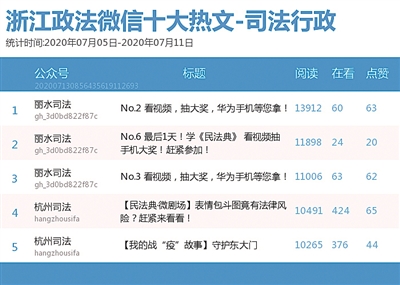 本期司法行政榜,“丽水司法”脱颖而出,拿下两榜榜首。热文榜上,“丽水司法”更是包揽前三。这3篇文章都是有奖竞答,通过竞赛形式来吸引群众参与学习民法典。想要“吸粉”的小编,也可以借鉴这种做法哦!