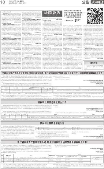 中国东方资产管理股份有限公司浙江省分公司 浙江省浙商资产管理有限公司债权转让通知暨债务催收联合公告
