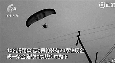 近日,泰国一女子中彩票赢得9000万泰铢(约2000万人民币)后,在自己生日当天,租来滑翔伞,从空中抛撒现金和黄金给邻里乡亲。该女子对当地记者说:“我想把幸福分享给我的兄弟姐妹和其他参加派对的客人。”