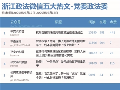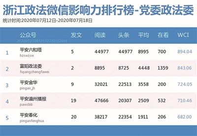 本期党委政法委榜,“平安六和塔”表现亮眼,拿下两榜第一。该公众号两篇文章入围热文榜前五名,其中《杭州互联网法院跨境贸易法庭挂牌成立》一文,荣登榜首。