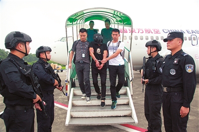 7月8日,一架从云南昆明起飞的飞机在台州路桥机场降落,逃犯张某杰被台州刑警押解下飞机。