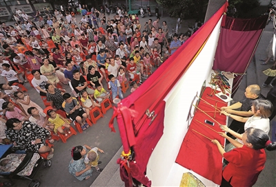 7月21日,杭州塘栖“卫家班皮影戏”到乔司街道和睦桥村“文化走亲”,演出《大战红孩儿》《鹬蚌相争 渔人得利》等精彩剧目。2016年,塘栖对杭州市非物质文化遗产“卫家班皮影戏”进行了抢救性保护,挑选年轻人开展皮影制作及皮影戏表演等培训。今年6月,15名新一代皮影戏传承人成功出师,以“文化走亲”的形式先后送戏到周边20个乡镇,丰富乡村百姓文化生活。林云龙 摄