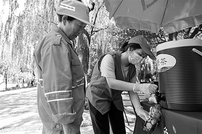 7月22日,农历大暑节气,杭州西湖风景名胜区志愿服务微笑亭推出的“免费凉茶”如约而至。
