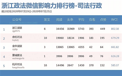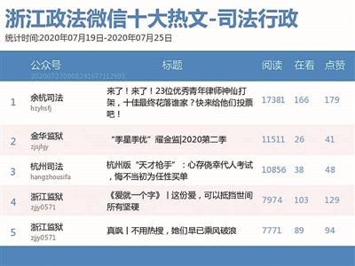 本期司法行政榜,影响力榜排名前三的依次为:“浙江监狱”“余杭司法”“金华监狱”。热文榜中,“余杭司法”《来了!来了!23位优秀青年律师神仙打架,十佳最终花落谁家?快来给他们投票吧!》一文夺冠。看来,投票活动仍是屡试不爽的吸粉利器呀!