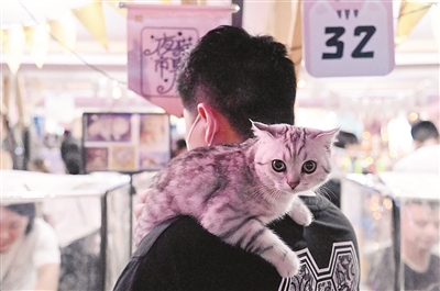市民带着自己的宠物猫逛“夜猫市集”。