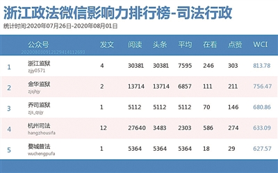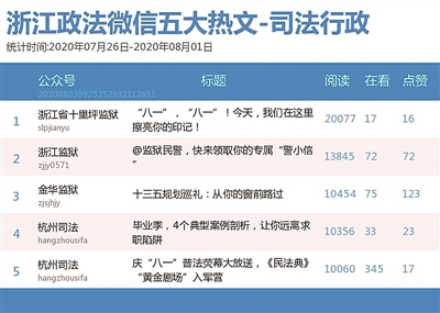 本期司法行政榜,“浙江监狱”蝉联冠军。热文榜上,“浙江省十里坪监狱”的《“八一”,“八一”!今天,我们在这里擦亮你的印记!》一文,记录了该单位开展“八一”建军节纪念活动的全过程,阅读数遥遥领先。