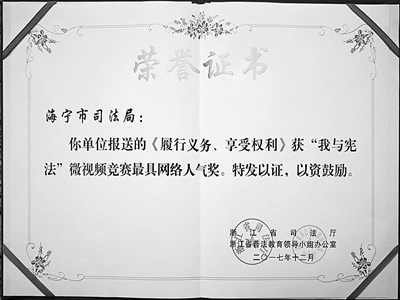 | 全国县级市首部宪法公益广告片——《履行义务·享受权利》获全省“我与宪法”微视频竞赛最具网络人气奖 |