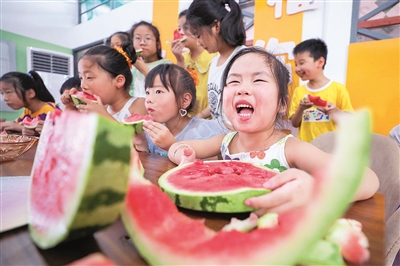 “立秋”将至,8月5日,湖州市南浔区和孚镇组织本地孩子与“小候鸟”们在幸福邻里中心一起开展“啃秋迎立秋”活动,体验悬秤称人、“贴秋膘”、吃西瓜“啃秋”等民俗,感受中华传统文化。